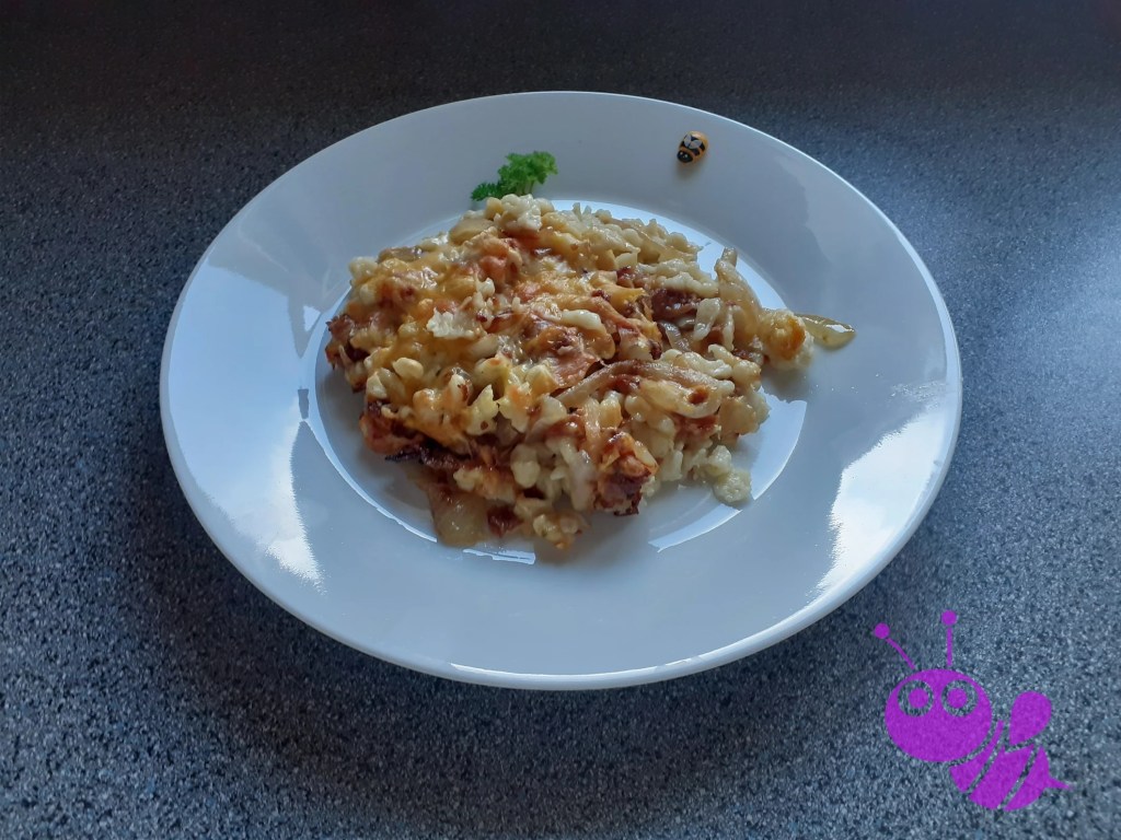Die Spätzle, Zwiebeln und ca. 2/3 des Käses nun in eine Auflaufform geben, durchrühren, den restlichen Käse darauf verteilen und das Ganze nun für ca. 15 – 20 Minuten im Ofen bei 170°C Umluft backen. Der Käse oben drauf sollte leicht Farbe bekommen.